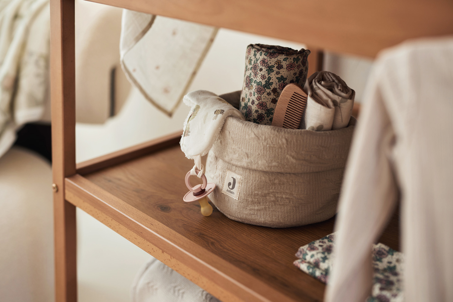 Orde op de Commode: Maak komaf met rommel op de commode met deze praktische mandjes. Berg verzorgingsproducten, luiertjes of haarspulletjes gemakkelijk op en tover de commode in een handomdraai om tot een opgeruimde plek. Het Soft Waves mandje kenmerkt zich door een speels crinkle golfjes patroon aan de buitenkant en is van afneembaar polyester aan de binnenkant, voor een hygiënische oplossing. Kies jij voor Nougat of Olive Green? Gemaakt van OEKO-TEX gecertificeerd katoen.